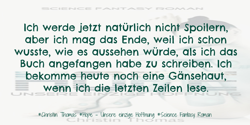 "Hope - Unsere einzige Hoffnung" hat mich persönlich begeistert und auch hier bin ich froh, dass mir die liebe Christin Thomas ein paar Fragen zum Buch beantwortet hat ... und als erstes sollte sie mir ihr Werk für euch in zwei bis drei Sätzen beschreiben: